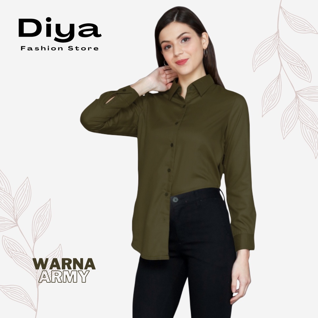 DiyaFashion Blouse Kemeja Wanita Korean Style Lengan Panjang Army Polos